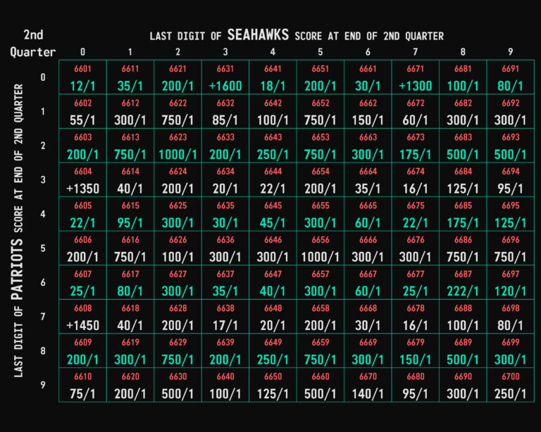 Circa Squares are offered for multiple scoring checkpoints throughout the game. You can bet on the first quarter, second quarter, third quarter, or the final score. Each board represents a separate market with its own pricing, allowing you to target early momentum, halftime scenarios, late-game outcomes, or the final result.