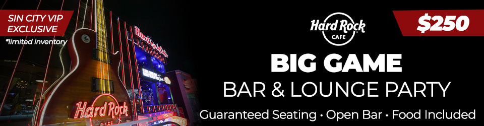 Experience the Big Game inside Hard Rock Cafe’s 2nd Floor Bar & Lounge, an exclusive Strip-view space limited to just 80 guests. This all-inclusive package features guaranteed seating, a premium open bar, chef-driven game day food stations, and big-screen viewing throughout the lounge. Everything you expect from the main Hard Rock party, in a more intimate setting.